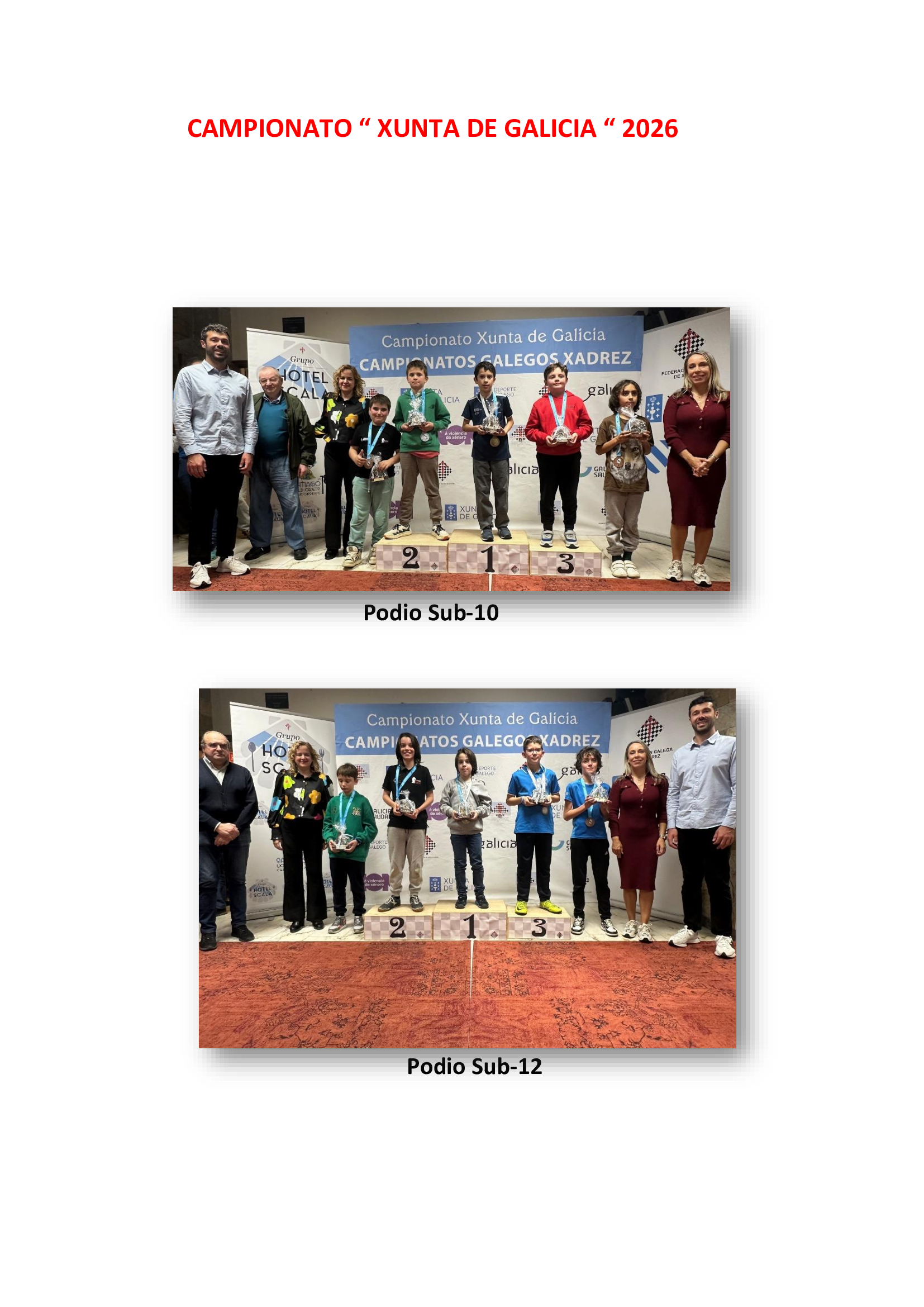 Ayer tuvo lugar la clausura y entrega de premios en el Hotel Scala (Padrón) de los Campeonatos Gallegos de Semana Santa 2026 “Xunta de Galicia”, categorías Sub-10 Open y Sub-12 Open.