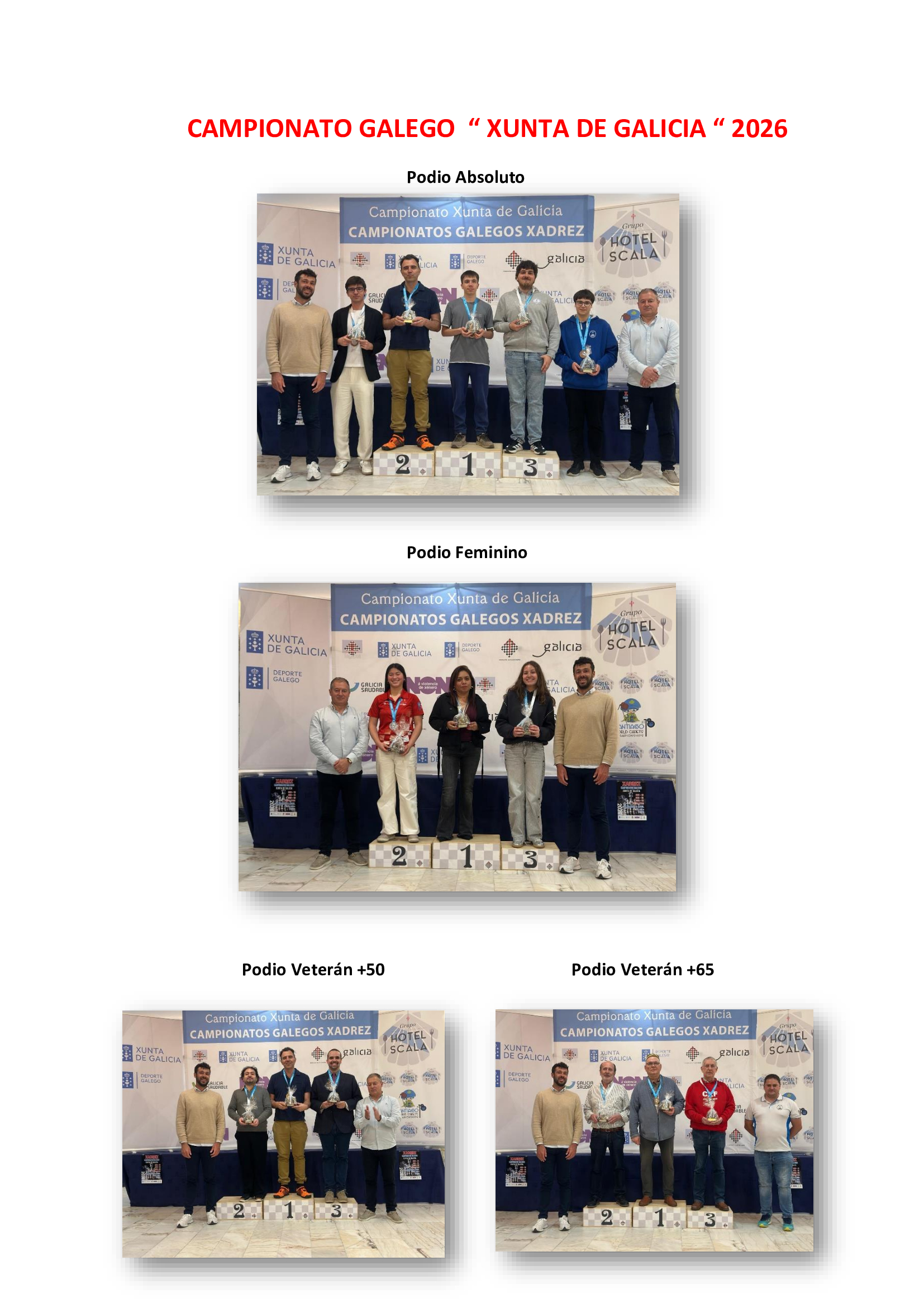 Ayer tuvo lugar la clausura y entrega de premios en el Hotel Scala (Padrón) de los Campeonatos «Xunta de Galicia» Absoluto, Feminino e Veterano 2026.