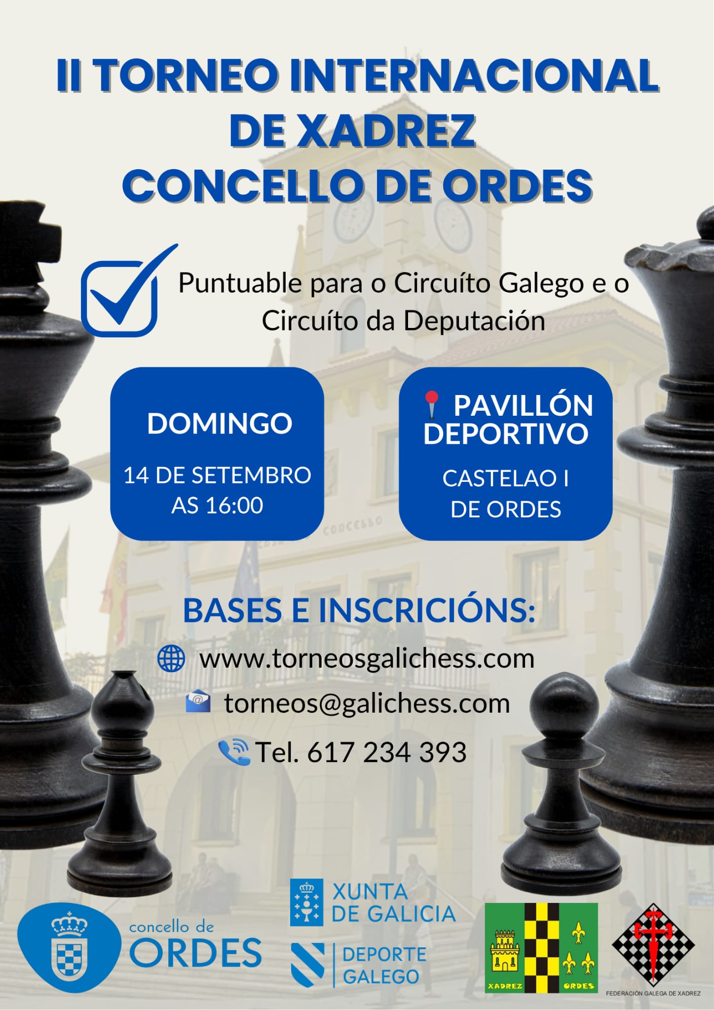 O Domingo, 14 de Setembro de 2025 no Pavillón Deportivo Castelao (Ordes) tivo lugar o 12º torneo pertencente ao XXXVI Circuito Galego de Xadrez Internacional 2025: II Aberto Concello de Ordes.