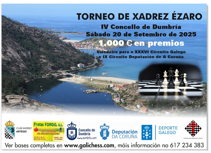 O Sábado, 20 de Setembro de 2025 en Dumbría (A Coruña) tivo lugar o 13º torneo pertencente ao XXXVI Circuito Galego de Xadrez Internacional 2025: IV Torneo Concello de Dumbría.