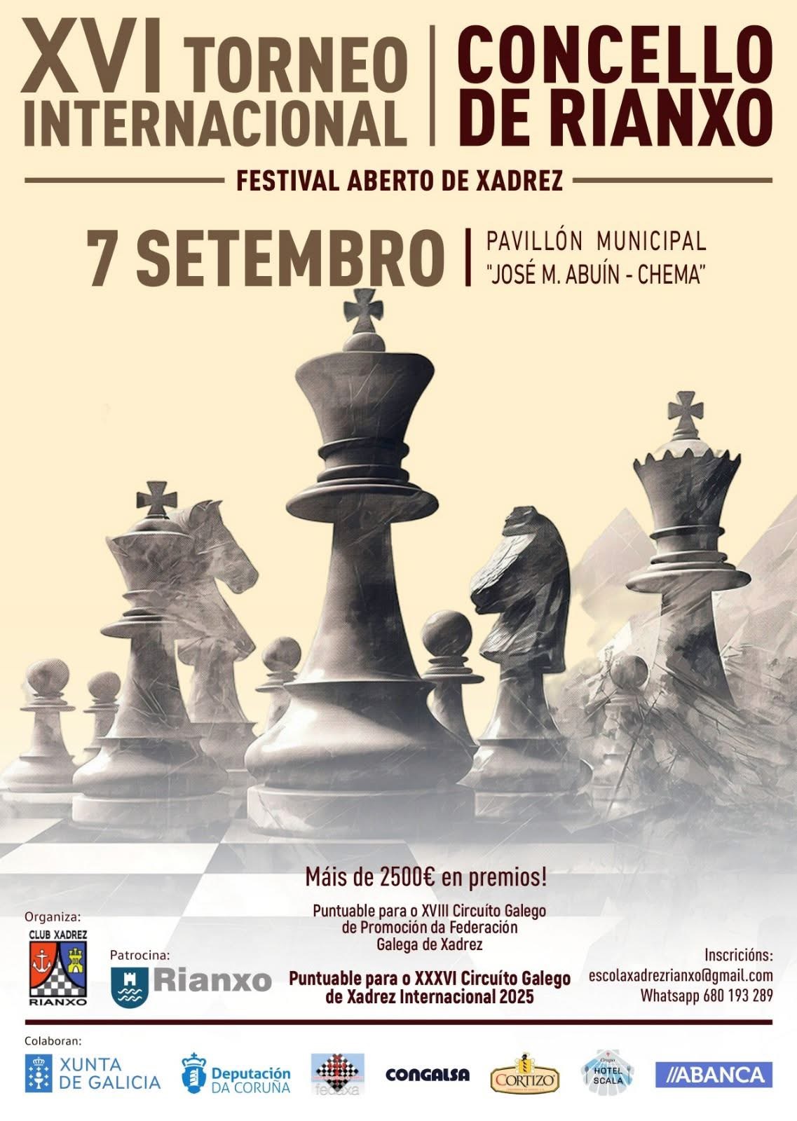 O Domingo, 7 de Setembro de 2025 no Pavillón de Deportes de Rianxo tivo lugar o 11º torneo pertencente ao XXXVI Circuito Galego de Xadrez Internacional 2025: XVI Torneo Internacional Concello de Rianxo.