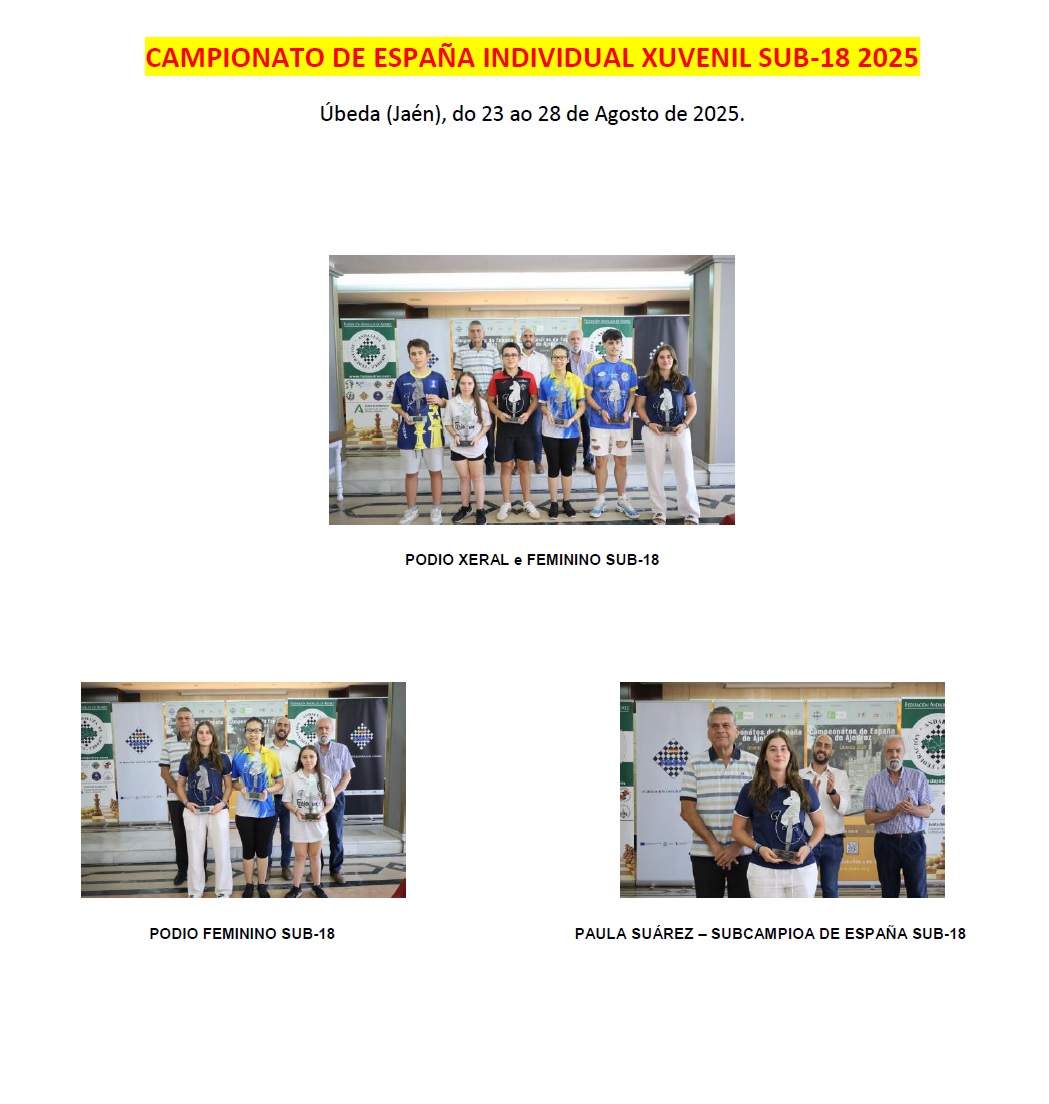 Onte (28/08/2025) tivo lugar a clausura e entrega de premios do Campionato de España Individual Xuvenil Sub-18 2025 que tivo lugar nos salóns do Hotel RL Ciudad de Úbeda (Jaén).