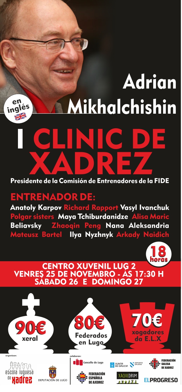 La Escola Luguesa de Xadrez en colaboración con la Exma. Diputación de Lugo y en colaboración con el Concello de Lugo, la Xunta de Galicia y o diario El Progreso; llevarán a cabo el I Clinic de Ajedrez, impartido por el GM Adrian Mikhalchisin.